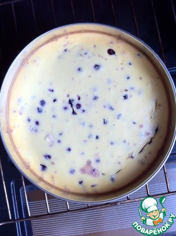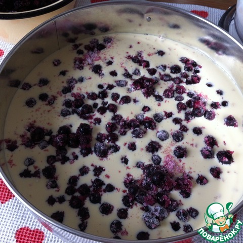 В форму с печеньем выливаем половину смеси, сверху распределяем ягоды и заливаем оставшейся массой.