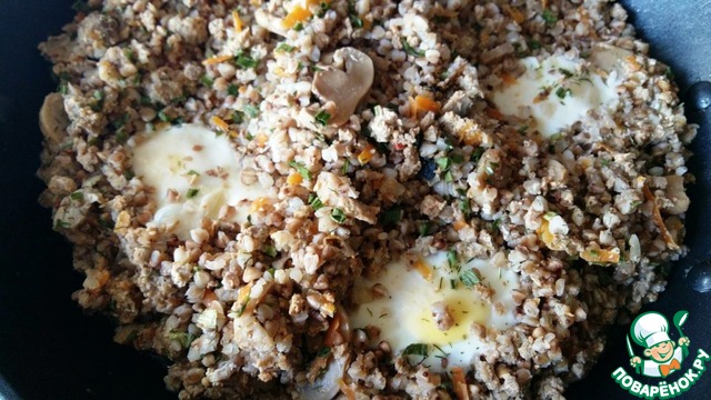 Теперь, когда вся вода впиталась, плиту выключаем. Делаем в каше углубления и вбиваем туда сырые яйца (по числу едоков). Накрываем крышкой и оставляем на 5-7 минут, чтобы яйца "схватились"