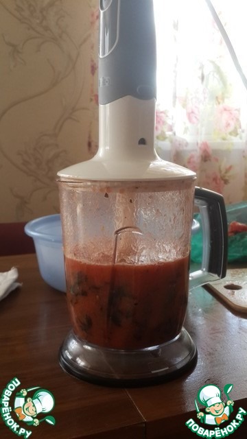 Помидоры залить кипятком и оставить минут на 5. Затем залить холодной водой. Когда остынут, снять кожицу. Порезать и поместить в блендер. Добавить соль и мяту. Измельчить.