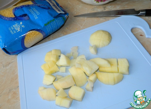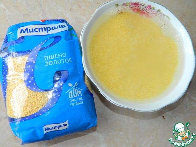 Пшено промыть холодной водой. Затем залить на несколько минут горячей водой. Воду слить.