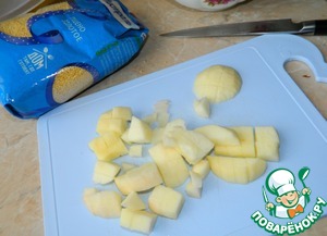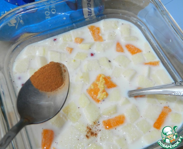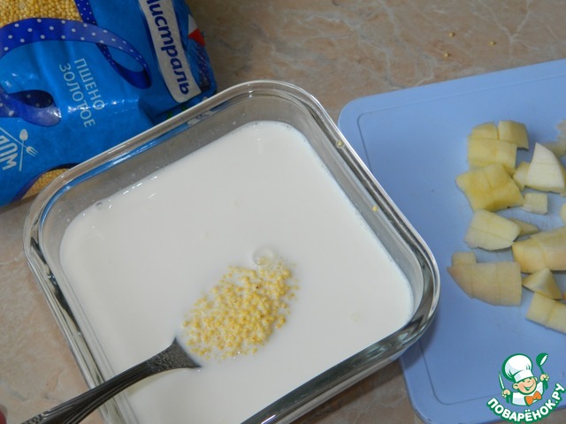 В жаростойкую форму выложить пшено. Влить молоко. Добавить яблоки.