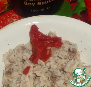 • Рыбный фарш смешиваем с перцем по вкусу и мускатным орехом.