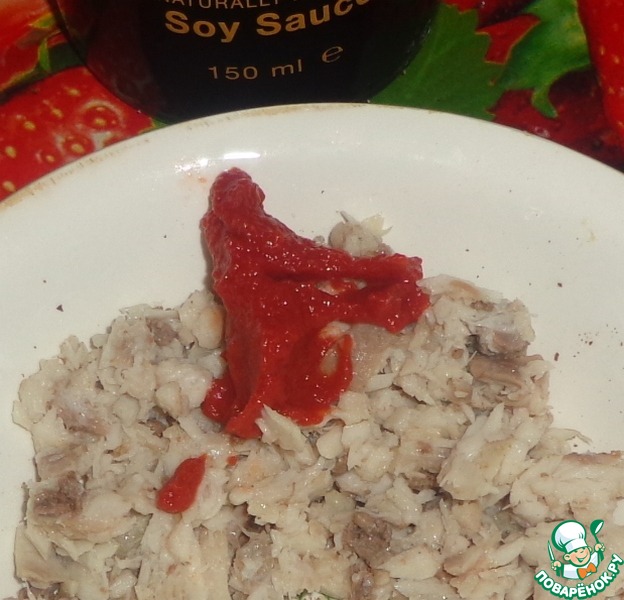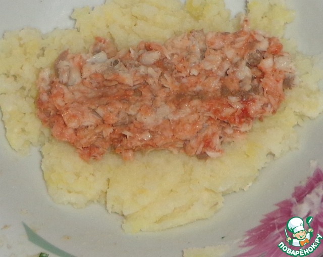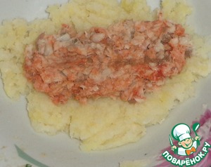 • Делаем лепешку из картофельной массы, по центру раскладываем рыбу в томате.