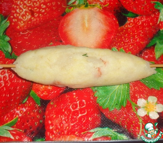 Шашлык из картофельной массы с начинкой из рыбы с томатной пастой.