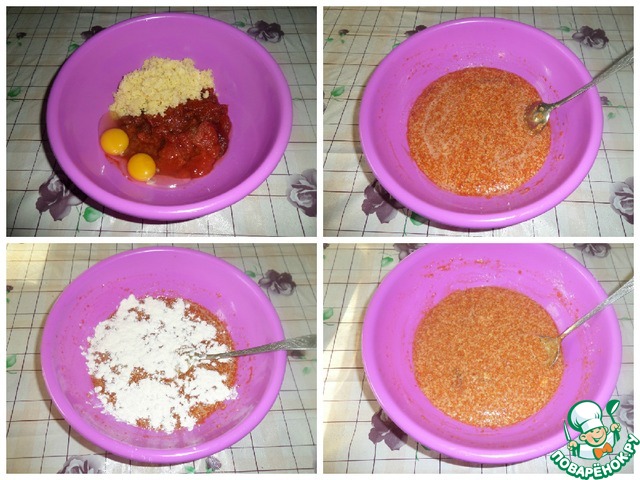 В чашку выкладываем икру, кускус, яйца и соль. Хорошо перемешиваем. Затем добавляем муку и еще раз перемешиваем.