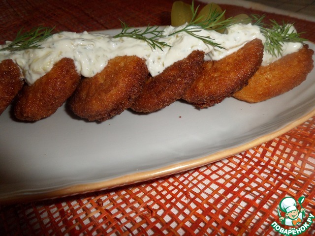 Подаем с соусом ( сметана, маринованный огурец, укроп ) и зеленью.