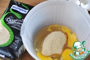 Делаем тесто. Берём яйца комнатной температуры, добавляем соль, сахар коричневый универсальный от "Мистраль" и взбиваем миксером до густой воздушной консистенции.