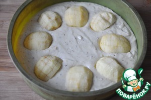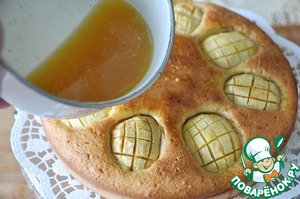 Горячий манник накалываем по всей поверхности зубочисткой и поливаем горячей заливкой. Особенно хорошо поливаем яблочки.