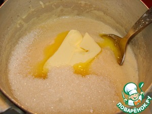 В кашу добавляем сливочное масло, 3 ст. ложки сахара (ориентируйтесь на свой вкус). Размешиваем, накрываем крышкой и оставляем на 10 минут.