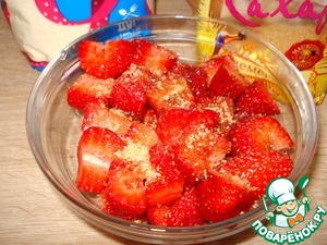 Пока каша запекается, приготовим соус. Клубнику порежем, добавим бальзамический уксус и коричневый сахар. Перемешаем, пусть постоит минут 20.