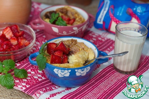 Быстрый вариант. Гурьевская каша отличный десерт, идеальна для завтрака, вкусно как в холодном виде, так и горячей. Готовили ее на пенках топленного молока, но занятие это долгое. Я Вам предлагаю очень быстрый вариант этого лакомства, на топленном молоке с клубникой. По вкусу напоминает крем-брюле с карамельной корочкой.