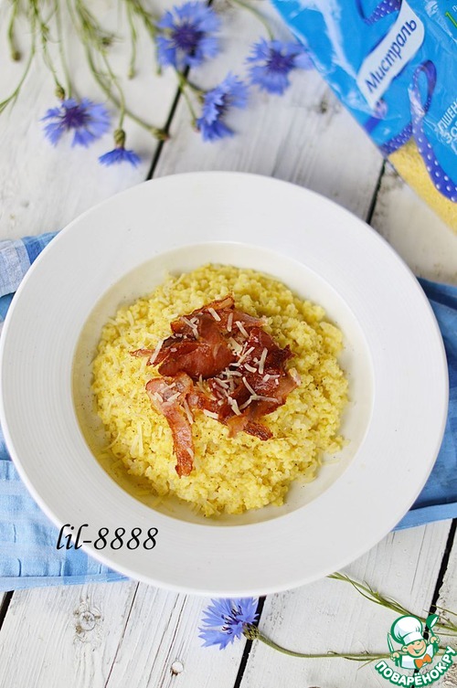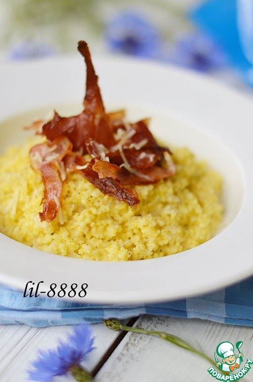 6. Бекон поджарить на сухой сковороде. Подавать кашу с полоской бекона.
