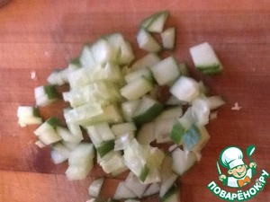 Режем и добавляем огурец. Все хорошенько перемешиваем.