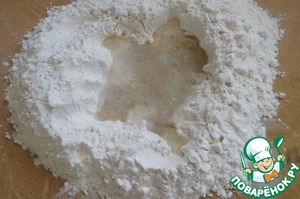 Сначала нужно приготовить тесто. Для этого горкой насыпаем муку на рабочую поверхность. Делаем углубление и вливаем в него растительное масло, уксус и небольшое количество воды, солим и начинаем замешивать тесто.