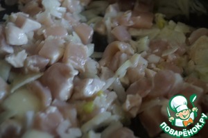 Теперь примемся за начинку. Для этого куриное филе режим небольшими квадратиками. Лук также мелко режем. Обжариваем на сковороде с оливковым маслом куриное филе, чеснок и лук.