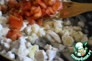 Добавляем мелко нарезанный 1 помидор и тушим минут 15, солим, перчим. Выключаем огонь и даем остыть начинке.