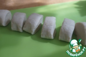 Тесто достаем из холодильника и формируем из него колбаску, делим на несколько частей. У меня получилось 9 равных частей.