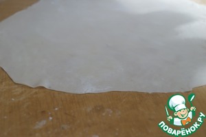 Раскатываем тесто в достаточно тонкий пласт. Чтобы оно не липло к скалке присыпаем немного его крахмалом и раскатываем в разные стороны тонко-тонко.