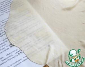 Затем растягиваем пласт теста в разные стороны на тыльной стороне рук. Тянем до того пока тесто не станет просвечивать, но главное следим за тем, чтобы оно не порвалось.