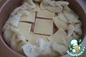 Оставшийся помидор режем тонкими кружочками и выкладываем поверх начинки. Сыр режем тонкими пластинами и также выкладываем на начинку. Собираем свисающие края теста, формируя бортик.