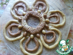 Цветочки я делала так: из разного теста делаем жгутики, как при лепке из пластилина. И выкладываем их в форме цветка, собирать лучше сразу на противне.