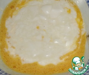 Кефир соединяем с яйцом и перемешиваем. Добавляем сахар и размешиваем.