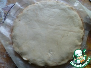 Каждую часть тонко раскатала ( 1 мм), приложила тарелку диаметром 20 см и вырезала круг.