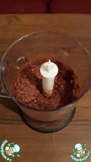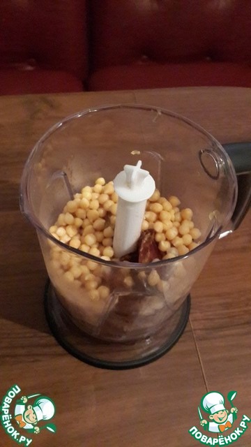 • В блендер отправить банан, апельсин, какао, орехи, нут и финики (воду слить).