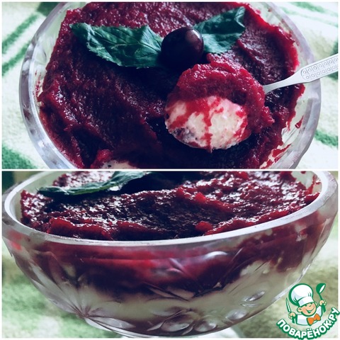 На первый слой вишни выложить творог, затем закрыть творог вишневой массой и убрать в холодильник минимум на 30 минут.