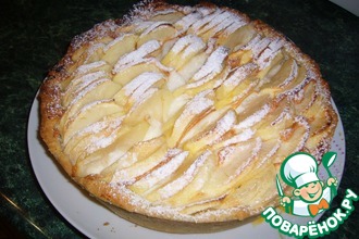 Готовый пирог посыпаем сахарной пудрой и нарезаем на порционные кусочки.