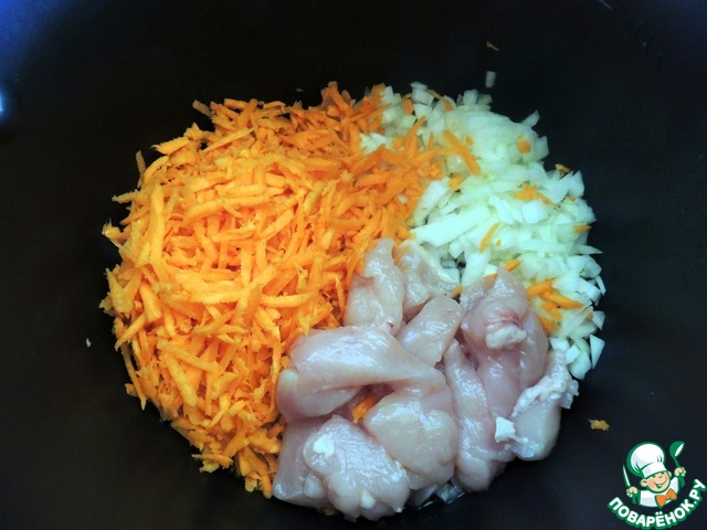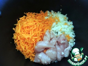 На дно чаши мультиварки наливаем растительное масло и обжариваем мясо и овощи на режиме жарка или мясо 5 минут при открытой крышке.