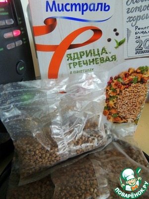 Берём гречку если надо перебираем и промываем. Меня очень выручает гречка от Мистраль, которая готова к применения и всегда чистая. Обычная гречка закончилась и я взяла 3 пакетика.