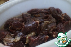 Мясо замаринуем. Для этого в контейнер с крышкой выкладываем нарезанное тонкими полосками мясо. Солим, перчим и добавляем специи для мяса, перемешиваем. Вливаем лимонный сок и подсолнечное масло, перемешиваем, накрываем крышкой и убираем в холодильник на 1 час.