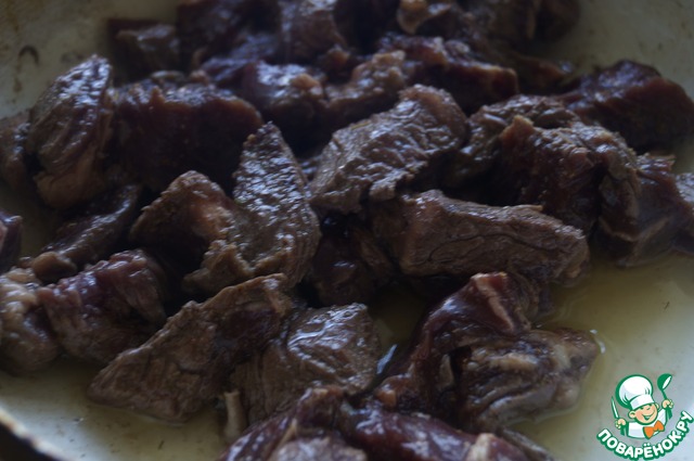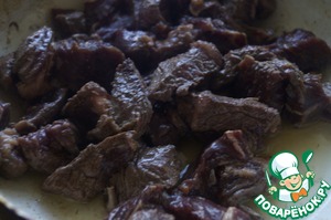 Затем достаем мясо из холодильника, разогреваем сковороду с маслом и на сильном огне жарим мясо до небольшого осветления.