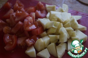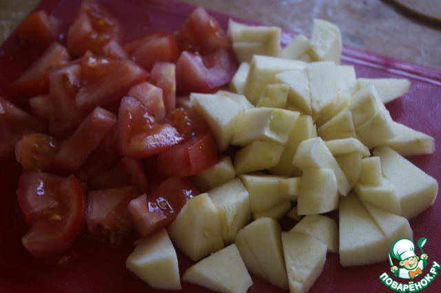 Небольшими кусочками режем очищенное яблоко и помидор. Лука мелко режем.
