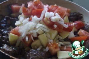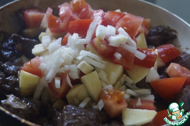 Добавляем нарезанные помидор, лук и яблоко к мясу, жарим 5 минут. Кладем томатную пасту, накрываем сковороду крышкой и тушим 25 минут.