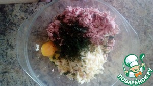 Далее занимаемся начинкой:колбасу, сыр натираем на терке, добавляем желтки, чеснок, любую зелень, все перемешиваем и наша начинка готова.