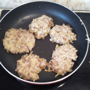 Приминаем ложкой и зачерпываем полную стол. ложку теста. На ладони слегка придаём тесту форму - круглой нетолстой лепёшки... Проще говоря, лепим дранники :)
