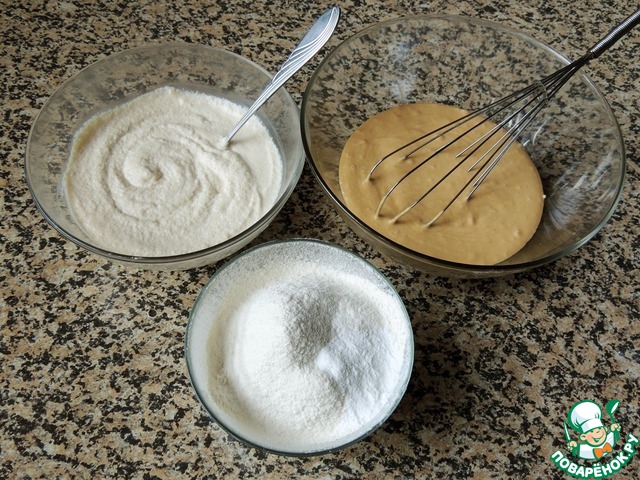 Смешать полученную смесь с разбухшей манкой, просеянной мукой и разрыхлителем.