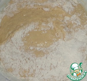 Добавляем полученную сухую смесь и замешиваем тесто. Консистенция теста - густая сметана.