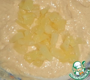 Ананас порезать небольшими кубиками и добавляем в тесто. Перемешиваем.