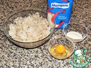 В рыбный фарш вбить яйцо, добавить манку, хорошо вымесить.
