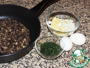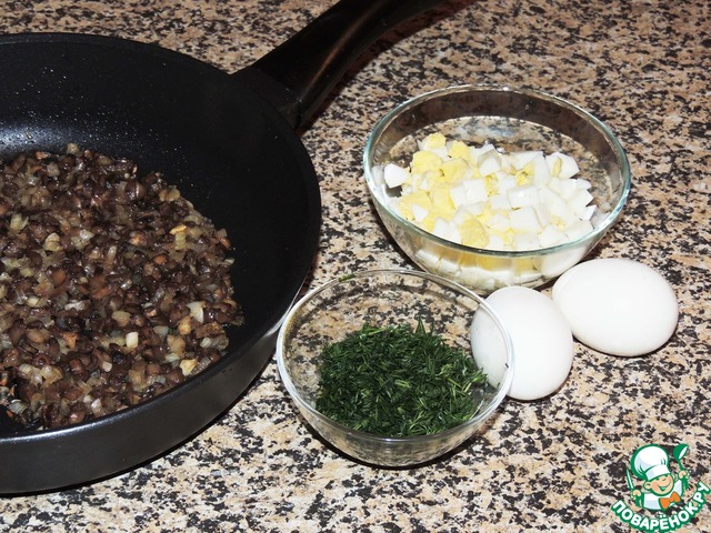 Для фарша обжарить на растительном масле мелко порезанные грибы и лук, смешать с отваренными порубленными яйцами и зеленью.