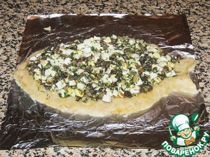 На фольге распределить половину рыбного фарша в форме рыбки. Выложить начинку.