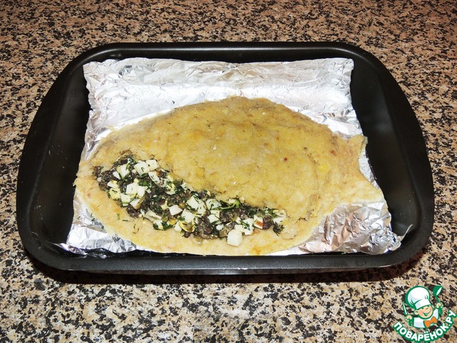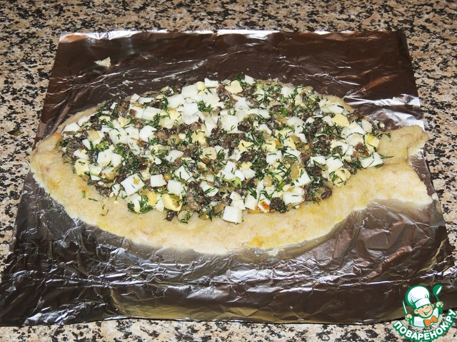 Закрыть сверху оставшимся фаршем и перенести в форму.