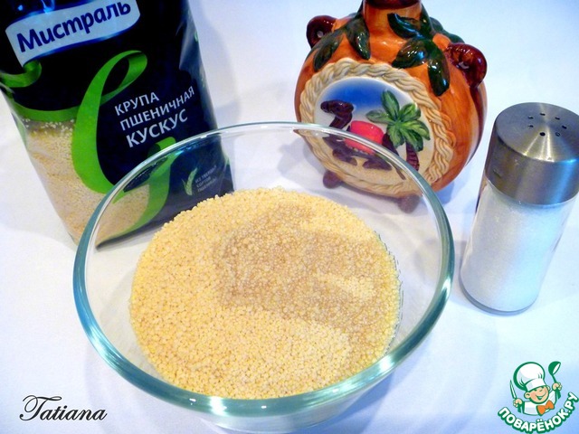 В кус-кус влейте 2 ст. л. оливкового масла, перемешайте, чтобы крупа равномерно промаслилась. Для приготовления кус-куса, на одну часть крупы, понадобится две части воды. Вскипятите воду, посолите (0,5 ч. л.), залейте горячей водой кус-кус, накройте крышкой, дайте воде полностью впитаться в крупу.
