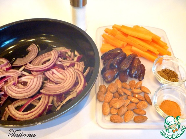 Лук нарежьте полукольцами, морковь крупными брусочками, из фиников удалите косточки. В небольшом количестве оливкового масла обжарьте до полупрозрачности лук, выложите на тарелку, в эту же сковороду
