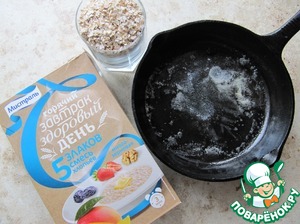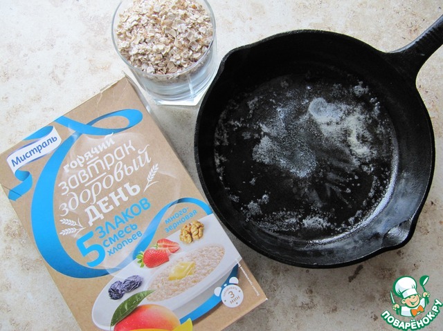 Для приготовления каши можно использовать любые хлопья от Мистраль по вашему вкусу, у меня смесь хлопьев - 5 злаков. Сковородку (форму для выпекания) смазать сливочным маслом.