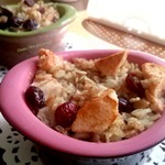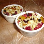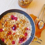 Выложить сверху кусочки масла и клюкву. Поскольку использовала хлопья быстрого приготовления, поэтому время запекания в предварительно разогретой до 180-200 С духовке ориентировочное - 15-20 минут, сначала накрыв фольгой, затем для подрумянивания под грилем несколько минут. Перед подачей полить медом. Вкусно и в горячем, и в холодном виде. Подавать прямо в форме.