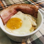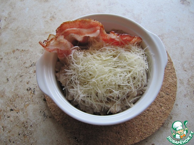 В горячую тарелку выложить порцию каши, сверху щедро посыпать сыром, выложить полоску бекона и яйцо-глазунью, добавить перец кайен по вкусу и желанию. Подавать немедленно!